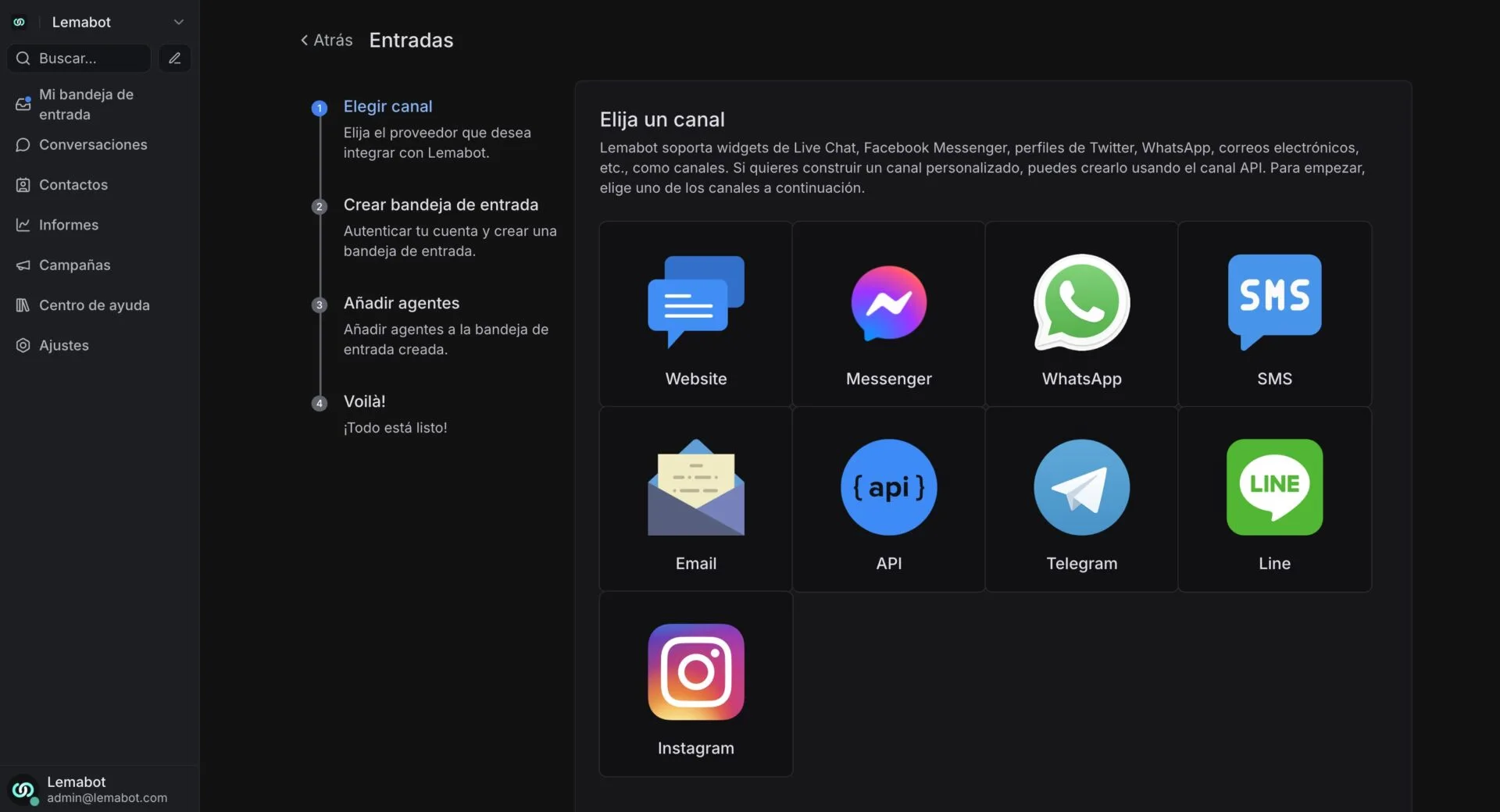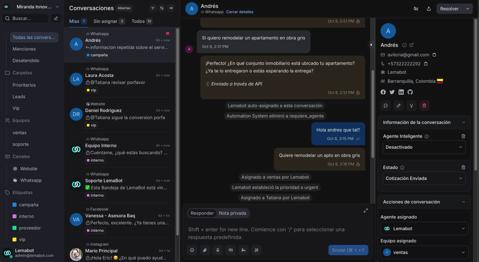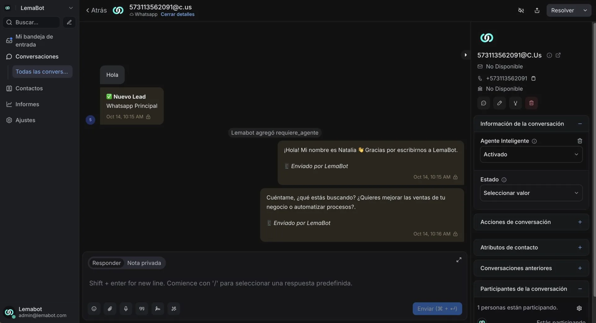 LemaBot es una plataforma que centraliza tus mensajes de WhatsApp, Instagram, Facebook y correo en un solo lugar. Te permite automatizar respuestas, organizar clientes y colaborar con tu equipo sin perder ningún mensaje.